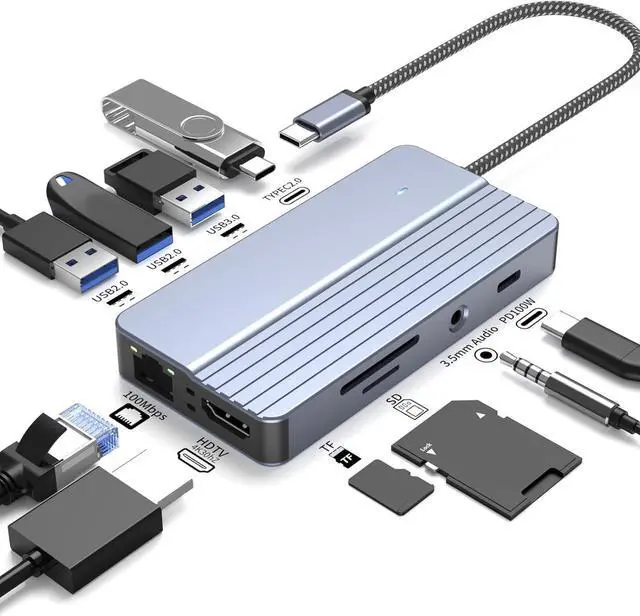 seamlessly connectivity with our 10 in 1 USB C Hubs, featuring HDTV 4K30Hz, RJ45 Ethernet, USB3.0, 3.5mm port, and memory card reader,PD100W Charging port for enhancing your devices capabilities.