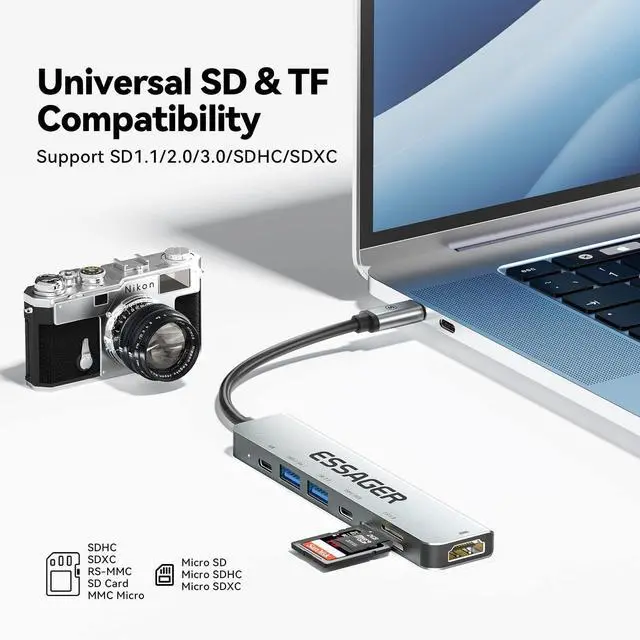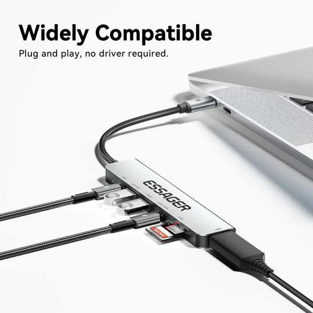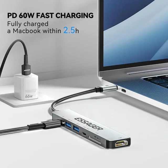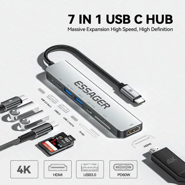 7-in-1 Multi-port USB C Hub: Essager USB C splitter is made of Aluminum material, expands a single USB-C port to 7 ports (1*HDMI 4K@30HZ, 2*USB 3.1, 1*USB-C, 1*Type-C PD charging, 1*MicroSD card slot, 1*SD card slot). It expands your work from home, office, or on the go.
