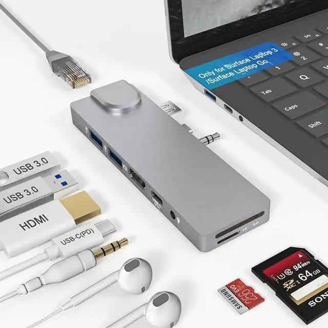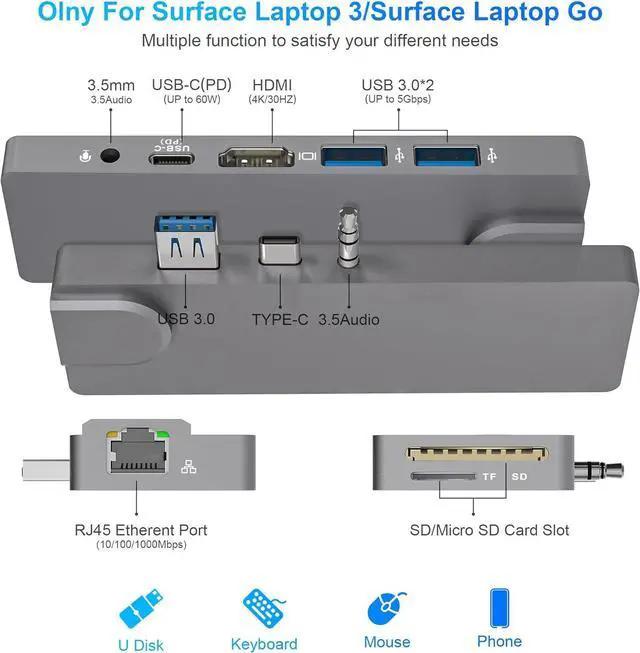 Design for Surface Laptop 5/Laptop 4/Laptop 3/Laptop Go: Surface Laptop 5/Laptop 4/Laptop 3/Laptop Go Hub Docking Station Turns the USB-A connection USB C and 3.5mm Audio into 8 ports (HDMI 4K/30Hz, 1000M Gigabit Ethernet LAN USB-C 60W PD Charging port, 2 x USB-A, SD & MicroSD Card Slot, 3.5mm Audio Port )*Note: This Surface Laptop 5/Laptop 4/Laptop 3/Laptop Go dock won't fit your surface very well if you use an protective case on it.