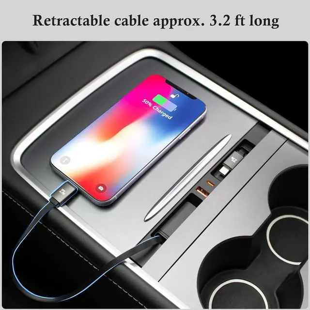 30W Retractable Fast Charging CableThe tesla usb hub with a retractable fast charging cable. Two in one dual interface Type-C and PD data cables support up to 30W fast charging function, saying goodbye to slow charging. The charging cable is 31.5 inches long and can be easily retracted to make the car's center console more tidy.