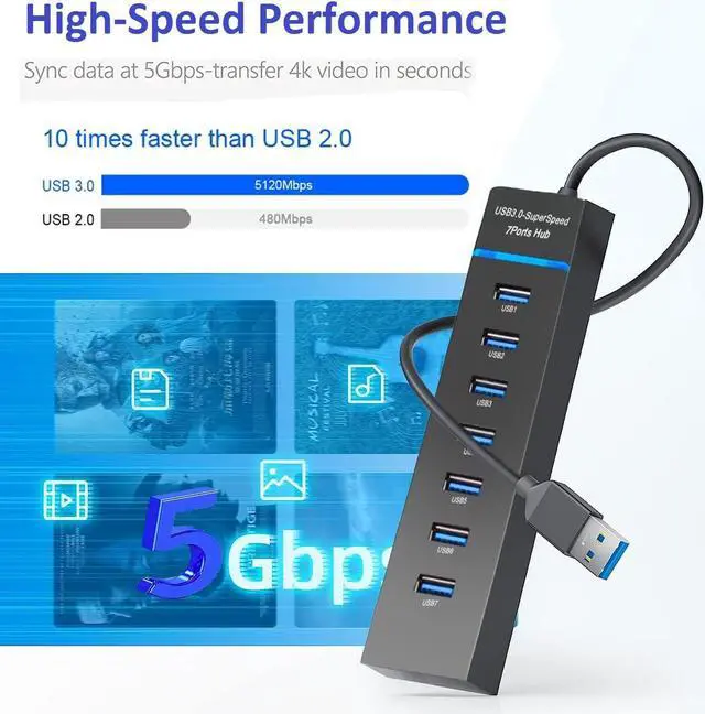 High-Speed PerformanceThis USB hub 3.0 syncs data at blazing speeds up to 5Gbps, which is more than 10 times faster than USB 2.0, fast enough to transfer an HD movie in seconds.