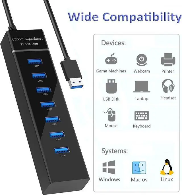 Wide Appliaction7-in-1 USB Hub Extender applies to various USB devices: laptop, pc tower, XBOX, PS4, flash drive, keyboard, mouse, card reader, HDD, cellphone OTG adapter, printer, camera, USB fan or any other USB Peripherals.