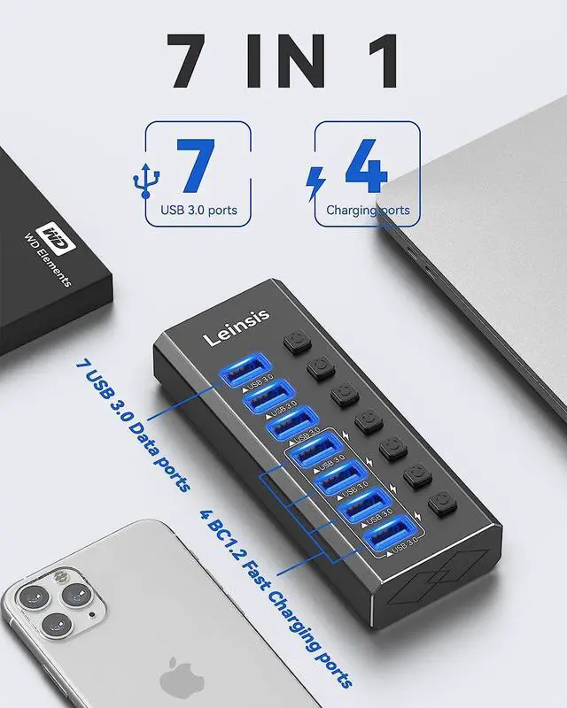 Easy Expansion & Smart ChargingSay goodbye to inadequate ports. Leinsis 7-port powered USB hub can expand 1 USB port to 7 external USB-A data ports for keyboard, mouse, camera and more, syncing data at blazing speeds up to 5Gbps. The charging ports of USB hub powered can provide up to 2.4Amps to charge your smartphone, tablet, etc