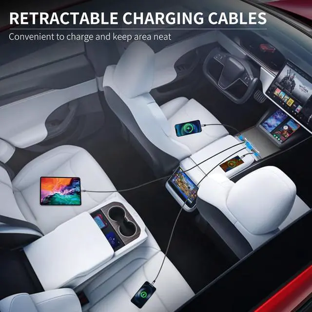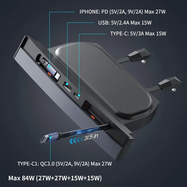 Retractable fast charging cable: PD maximum 27 W, Type-C maximum 18 W, 31.5 inch long cable ensures fast and reliable charging without overcharging the interior of the car.