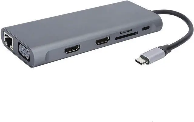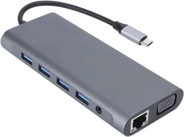 [MULTI-FUNCTIONAL USB C HUB] This 12-in-1 USB C hub features multiple ports including Gigabit Ethernet, dual HDMI, VGA, 4 USB 3.0, USB-C data, AUX, and memory card slots.
