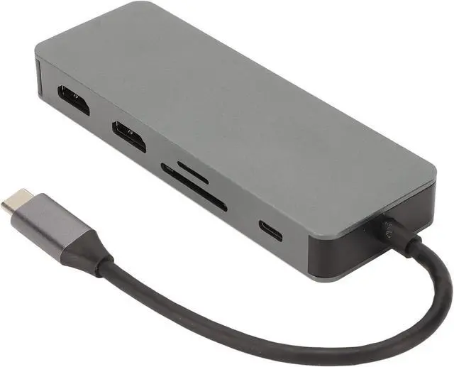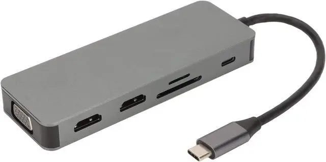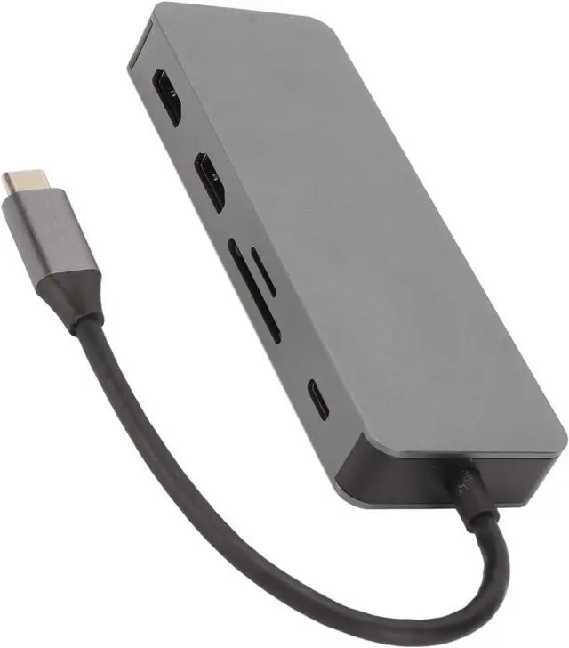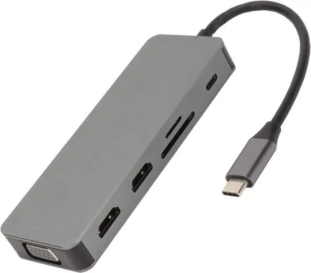 10 in 1 USB C Hub: Expand your device to 2 4K 30Hz High Definition Multimedia Interface ports, VGA port, 2 USB2.0 data ports, 1 USB3.0 port, 100W PD charging port, Storage Card Memory Card reader and 3.5mm audio via USB C port interface.
