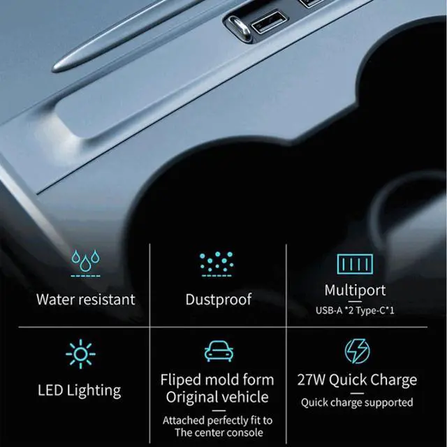 This center console hub has LED lights, you can manually press the button to light up your storage compartment. When you want to turn off the LED light, you can choose to press the, or wait for two minutes to turn off automatically.(
