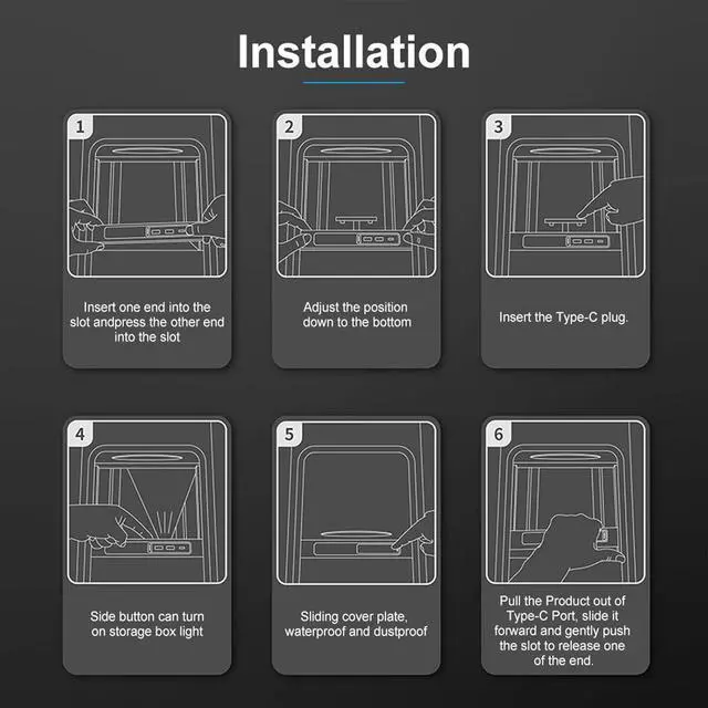 • This center console hub has LED lights, you can manually press the button to light up your storage compartment. When you want to turn off the LED light, you can choose to press the, or wait for two minutes to turn off automatically.(