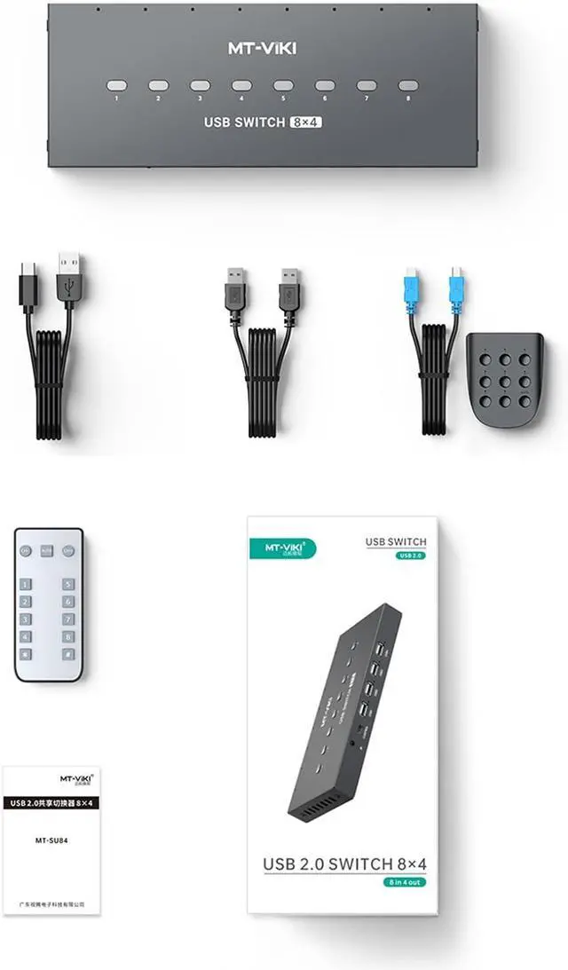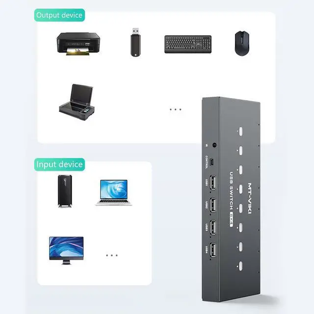 manage multiple devices with 8 in 4 out USB Switching allowing up to 8 computers to share a single set of peripherals such as a keyboards, and printer, enhancing productivity and efficiency.