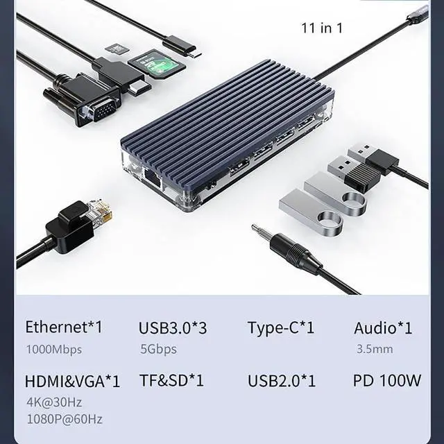 Huge 11-Port Expansion: Equipped with 4K@30Hz HDMI, 1080P VGA, 100W PD, 3 USB 3.0 ports, USB 2.0 ports, 1000Mbps Ethernet, SD/TF card reader, 3.5mm audio ports.
