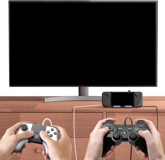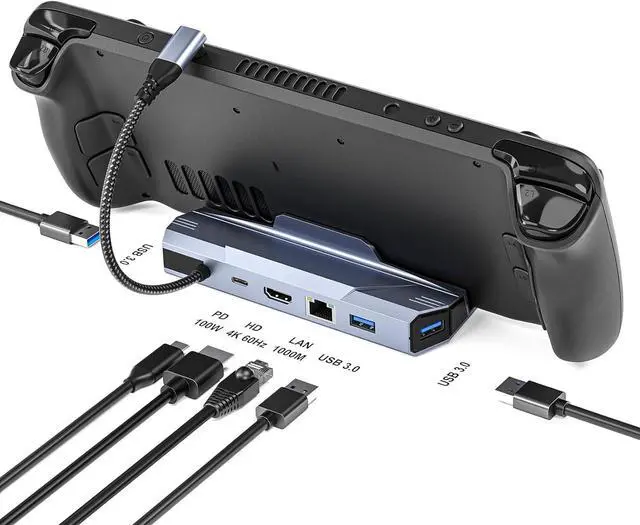 Connectivitys with 6 in 1 docking station, for SteamDeck, featuring USB A, USB C, HDMI2.0, and gigabit Ethernet port for device connection.