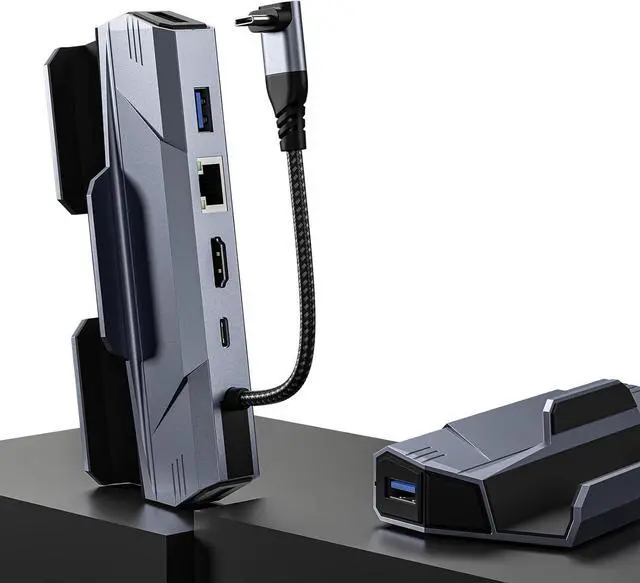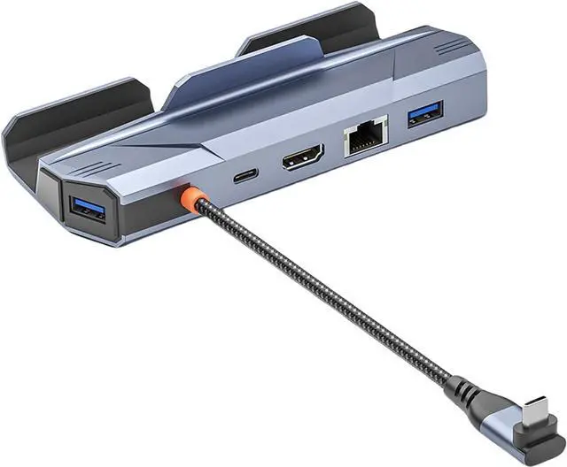 Connectivitys with 6 in 1 docking station, for SteamDeck, featuring USB A, USB C, HDMI2.0, and gigabit Ethernet port for device connection.