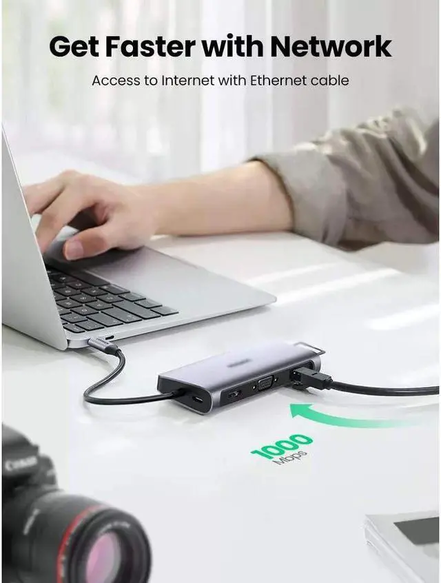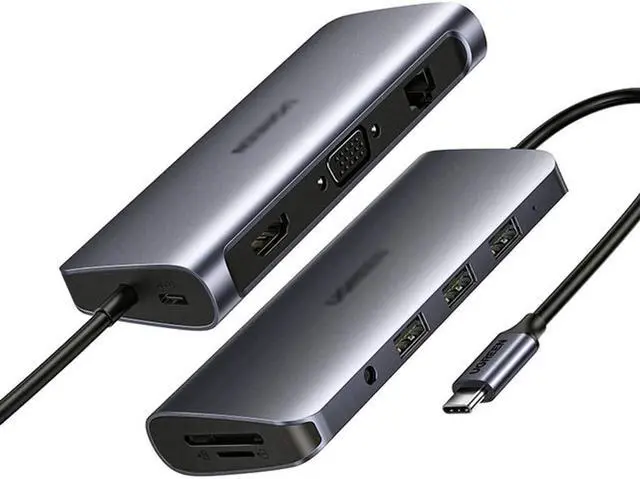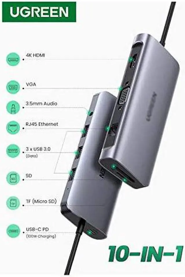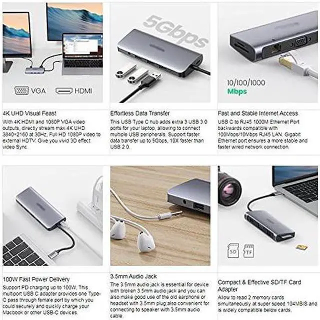 10-in-1 Multi Port Type C Docking Station Expand your macbook with 4K HDMI, 1080P VGA, Gigabit Ethernet, 3 USB 3.0 port, TF SD card reader, 100Wtype C PD charging port and a 3.5mm Audio jack.