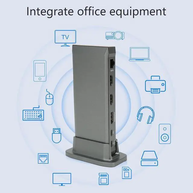 13 in 1: Laptop docking station expands a single USB C port of your notebook or phone into 13 ports. The docking station provides USB Cx2, USB3.0x3, HD Multimedia Interfacex2, DisplayPort, 3.5mm Audio, RJ45, PD3.0 Power Port, Storage Card/Memory Card Reader.