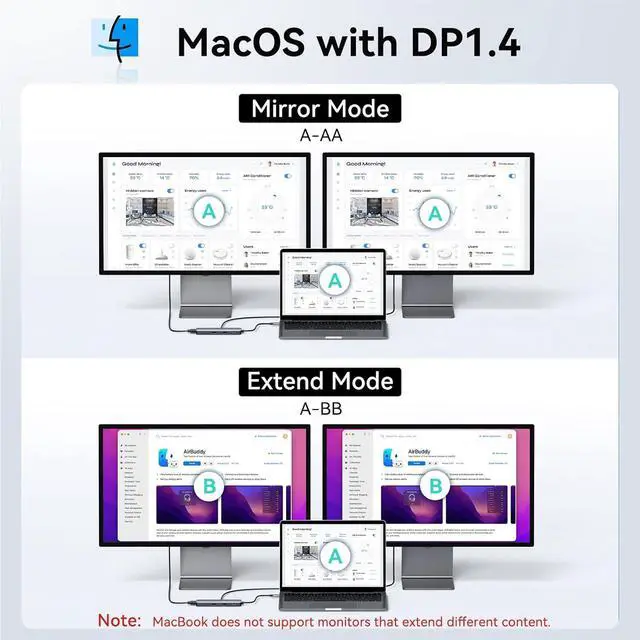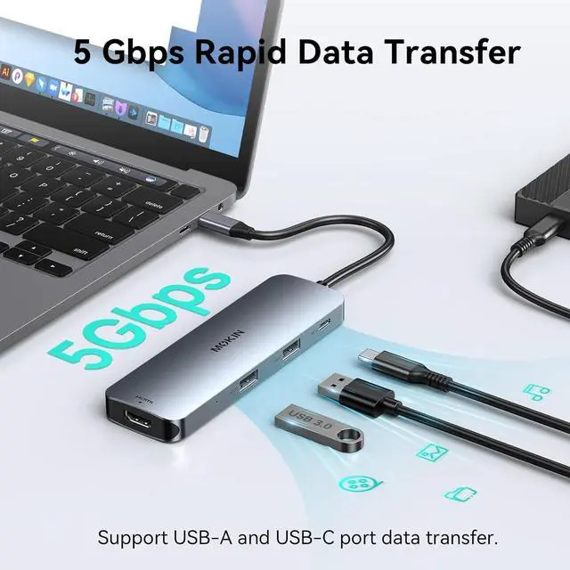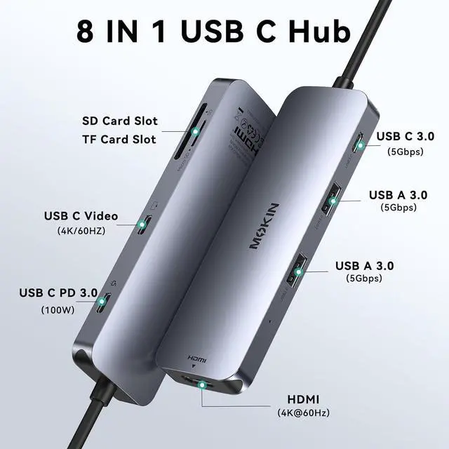 iMOKiN Laptop Docking Station Dual Monitor, get your work more efficient. The 8-in-1 USBC hub is designed to fulfill all your needs while working, studying, or watching movies. USB C docking station for laptop features one HDMI ports (supporting 4K at 60Hz), one USB-C Video Port 1.4 (supporting 4K at 60Hz), one USB-C 3.0 ports for data transmission at speeds of up to 5Gbps, two USB-A 3.0 ports for data transmission at speeds of up to 5Gbps, one SD/TF card reader, and one USB-C 100W Power Delivery (PD) charging port. This compact and user-friendly USB-C hub, usb c to dual HDMI adapter enhances efficiency and caters to your creative needs
