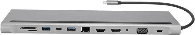SpecificationItem Type: 12-in-1 DockingMaterial: Aluminum alloyInterface: 2 x USB3.0, 1 x USB2.0, 2 x interface, 1 x VGA interface, 1 x PD interface, 1 x 3.5MM interface, 1 x small memory card, 1 x memory card, 1 x RJ45 interface, 1 x Type-C interfaceRJ45: 100M ethernet port is backward compatibleUSB: 2 x USB3.0, 1 x USB2.0: 2 x 4K HDVGA: HD 1080pPD: Up to 87W, backward compatibilityAudio: Approx. 3.5mm / 0.1in audio interfaceDual Card Slot: Memory card/small memory card