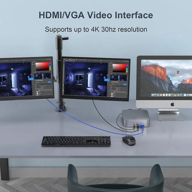 High-Def Video OutputThis device supports HDMI and VGA dual display ports, with HDMI supporting 4K30Hz high-definition video output and VGA supporting 1080P resolution, meeting your high-definition video playback needs in different scenarios.