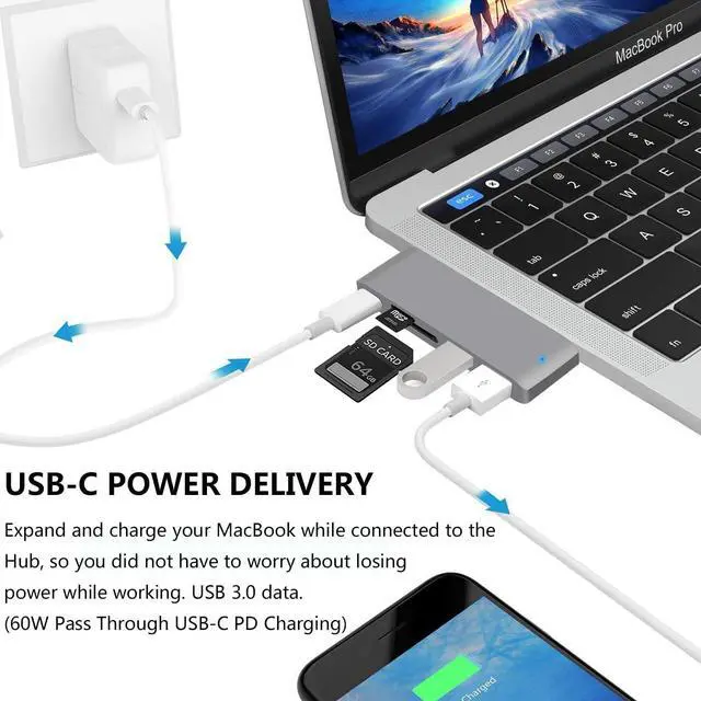 USB-C POWER DELIVERY - Expand and charge your MacBook while connected to the Hub, so you donât have to worry about losing power while youâre working. USB 3.0 data. (60W Pass Through USB-C PD Charging)