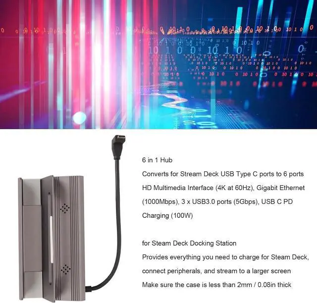 6 IN 1 HUB: For Steam Deck docking station is plug and play. Converts for USB Type C ports into 6 ports: HD Multimedia Interface (4K at 60Hz), Gigabit Ethernet (1000Mbps), 3 x USB3.0 ports (5Gbps), USB C PD charging (100W).