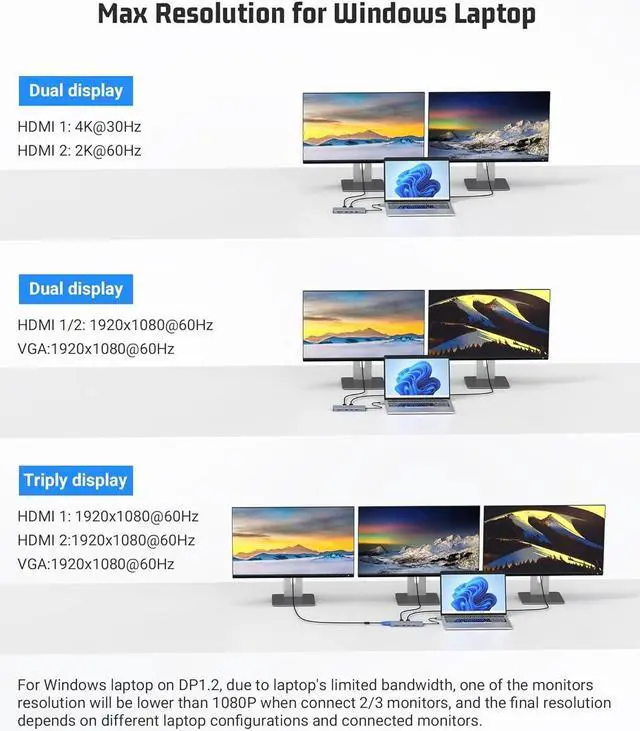 Stunning 4K Video Output Experience stunning 4K video output by utilizing 2 * HDMI ports and 1 * VGA port simultaneously. Connect your MacBook to a monitor or TV and enjoy breathtaking image quality, with vibrant 3D visuals and lifelike precision.
