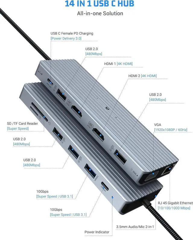 Versatile Multiport Docking Station Experience ultimate versatility with our USB C Hub, featuring 24K HDMI, 1VGA, 1USB A 3.1, 1USB C 3.1, 4*USB A 2.0, Gigabit Ethernet, SD&TF card slots, 100W PD, and a 3.5 mm jack. Compatible with most Type C devices, it caters to all your daily work and lifestyle port requirements.