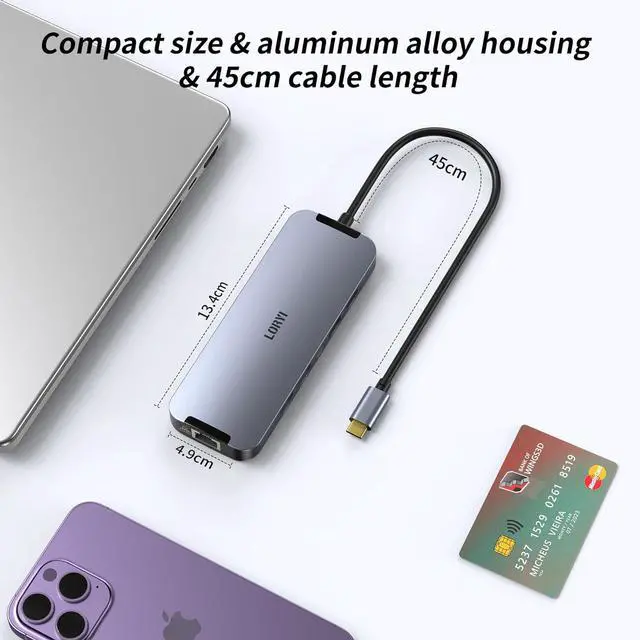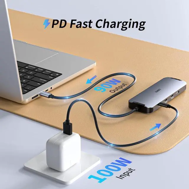 PD100W Fast Charging: This USB-C hub is equipped with a PD100W port via the Type-C port. Since the hub itself requires power, the actual output is 90W (depending on the device), providing stable video output and data transfer for your laptop, avoiding productivity and entertainment issues due to power shortages