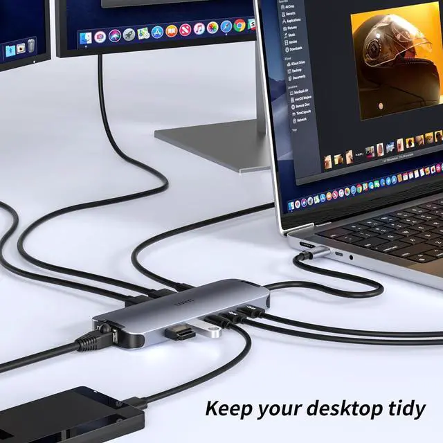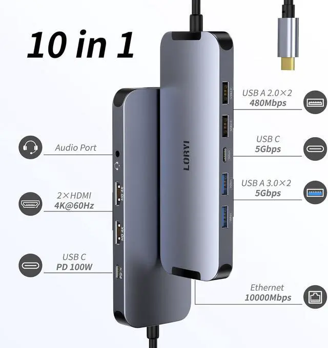 10-in-1 USB-C Docking Station: Equipped with 2 HDMI 4K@60Hz ports, PD100W port, 1000Mbps Ethernet port, 2 USB A 3.0 ports, 1 USB C 3.0 port, 2 USB 2.0 ports, and 1 audio jack. It has a total of 10 ports, and all can be connected to your laptop through a single USB-C hub. Please ensure that your laptop's USB-C port supports DP Alt mode