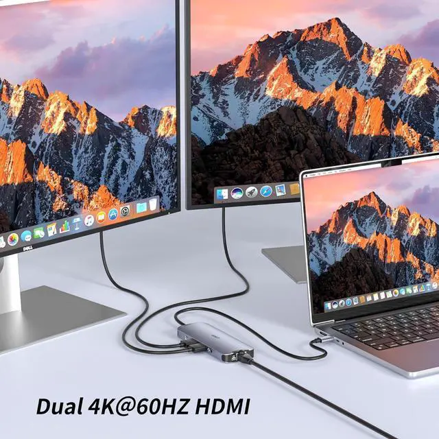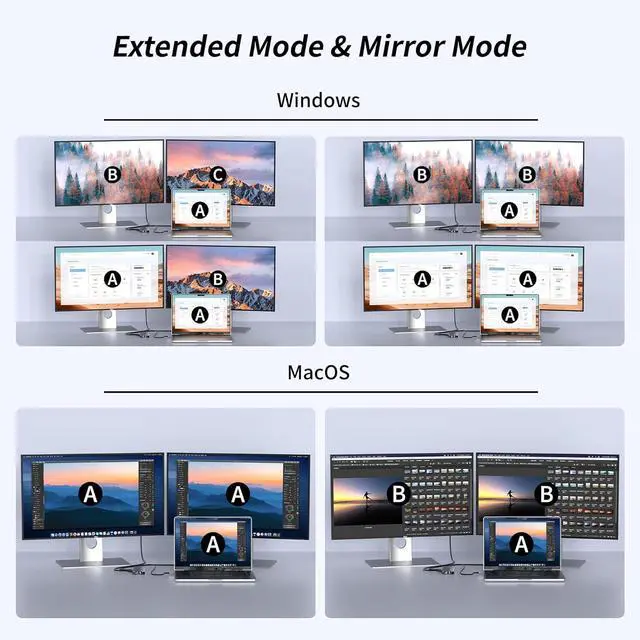 Dual 4K@60Hz High Resolution: Using the 2 HDMI ports, you can add up to 2 4K high-definition monitors. Windows systems support both Mirroring mode and Extended mode (AAA, ABB, ABC), while Mac OS only supports Mirroring mode (AAA, ABB) due to system restrictions. Note: To achieve dual 4K@60Hz, make sure your USB-C port supports DP Alt 1.4