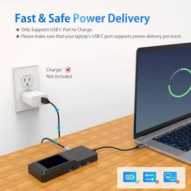 [RJ45 Ethernet And 100W Power] The RJ45 Gigabit Ethernet port provides up to 1Gbps speed and automatically adapts to 10, 100Mbps speeds to ensure a more stable and wired connection. The docking station supports up to 100W of power input and provides up to 100W of safe and fast charging for connected laptops.