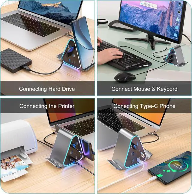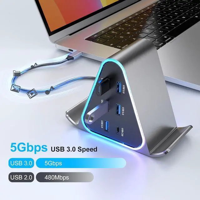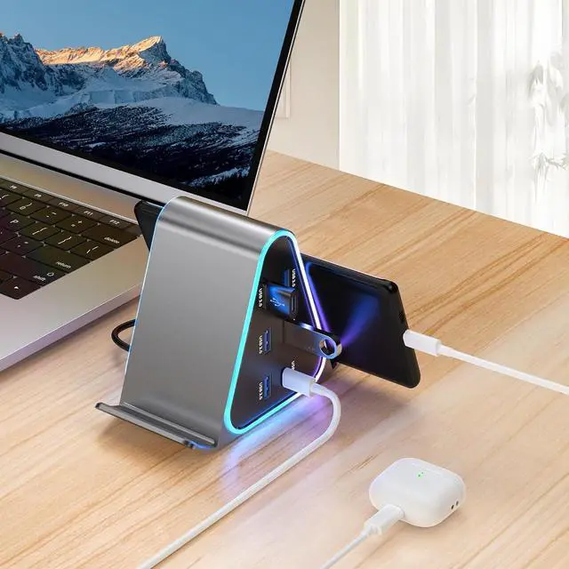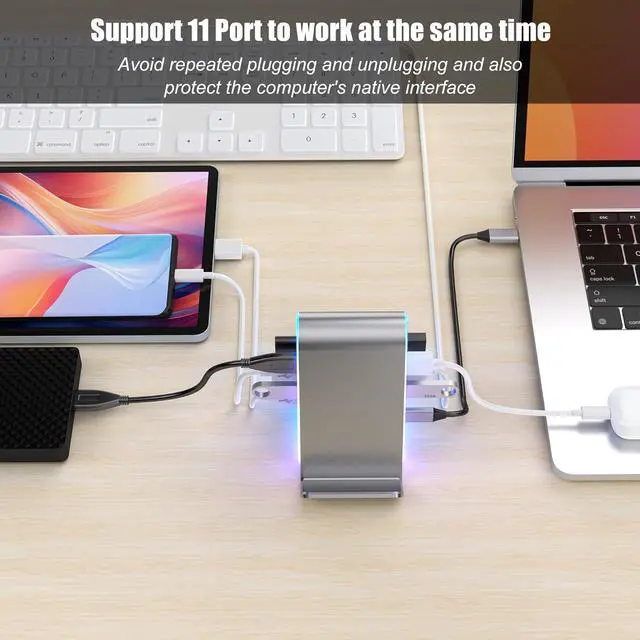UBS C power design for continuous power supply without interruption:The independent UBS C power input port supports 5V power supply, which can provide long-lasting power supply for small devices such as external hard disk, smartwatch, etc., and it's an ideal companion for mobile office and teleconferencing. It can also be used as a cell phone, tablet stand.
