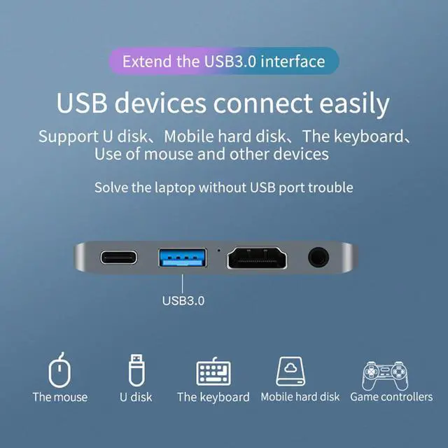 USB DOCKING STATION:4-in-1 USB hub with HDMI interface, standard USB3.0 interfaces, 60W PD fast charging, 3.5 Audio Port, plug and play