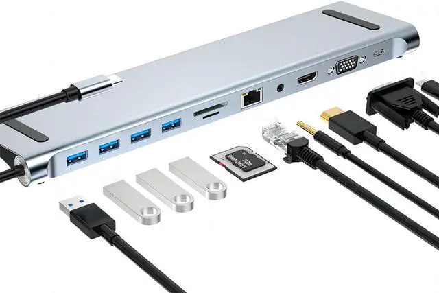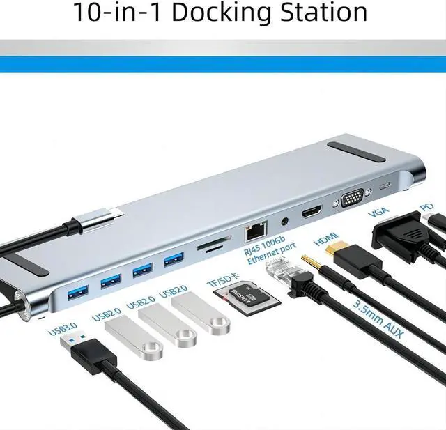 Multi-functionThis 10-in-1 docking station has USB 3.0*1, USB2.0*3, RJ45 100Mbps LAN port*1, PD charging*1, 4K 30HZ 1080P*1, VGA*1, TF*1, SD*1, 3.5mm AUX function to meet a variety of needs.