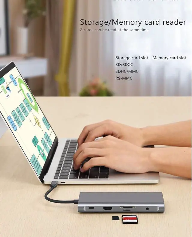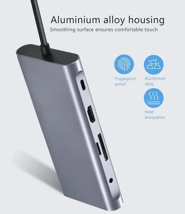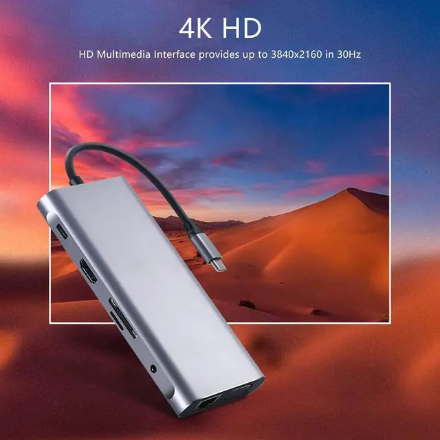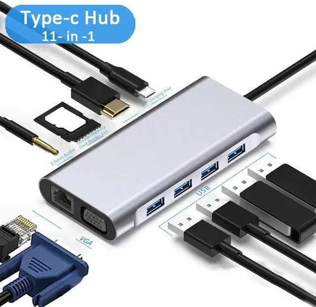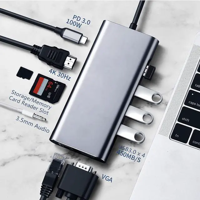 11 IN 1 DESIGN: This USB C hub provides 4 x USB 3.0, 1 x PD port, 1 x 4K HD Multimedia Interface, 1 x VGA interface, 1 x RJ45 Ethernet port, 1 x 3.5mm audio port, memory card slot and storage card slot.