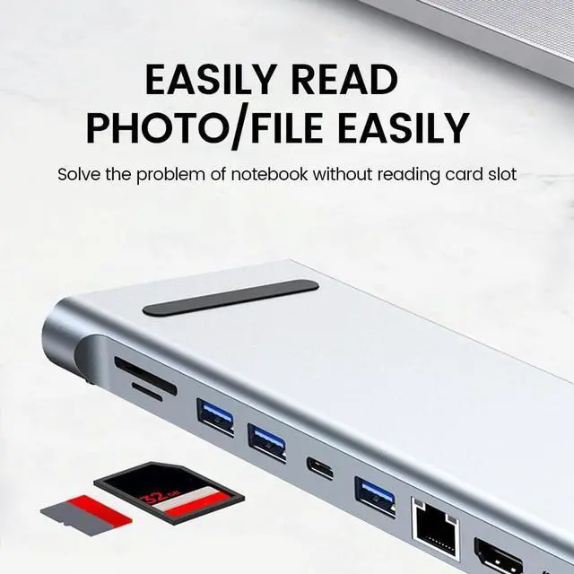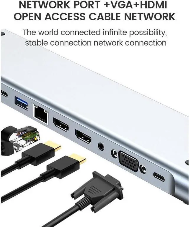 4.Easy to read photos/files, easy to transfer 2.No need to drive plug and play 3.Enjoy wired network with Ethernet port, VGA, and Description/Features: 1.Twelve in One Dock for More Efficient Office 5.Aluminum alloy body material