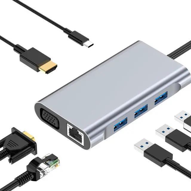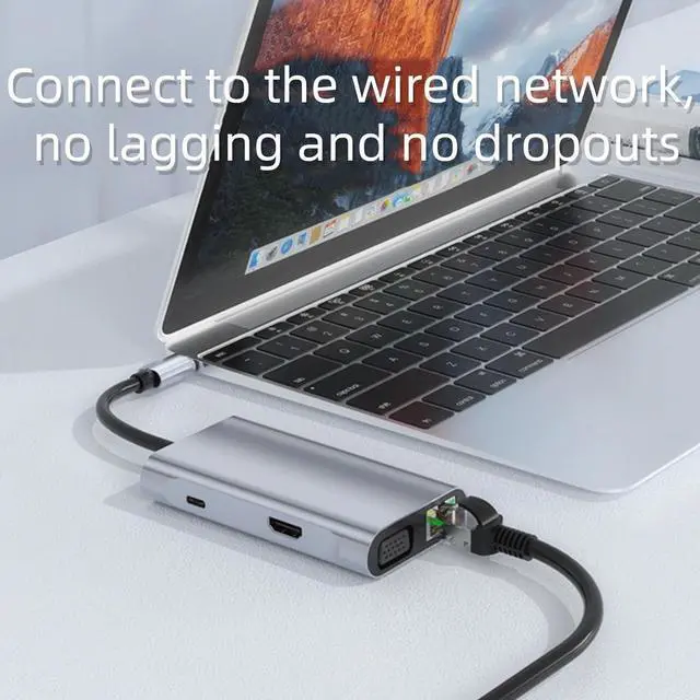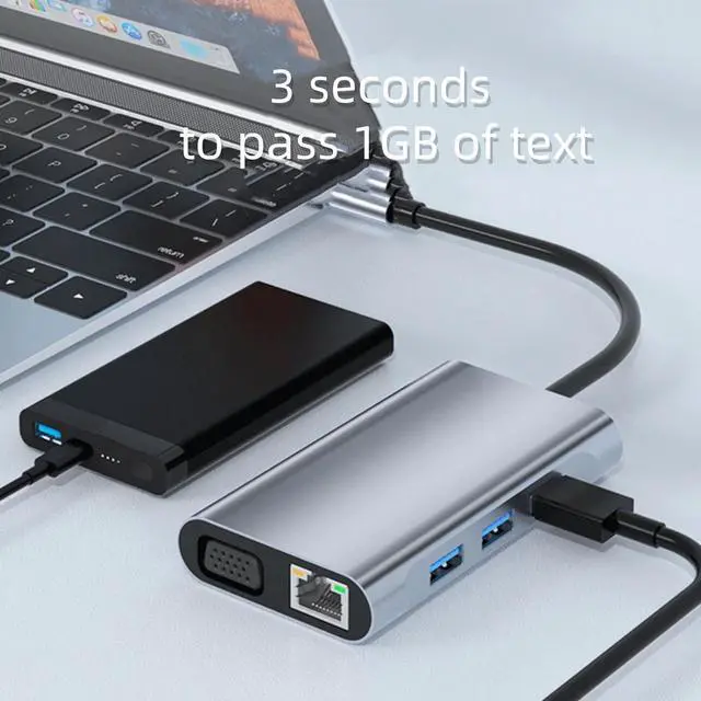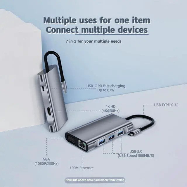 Multi-functionThis 7-in-1 docking station has 5Gbps USB 3.0*3, 87W USB-C PD charging*1, HDMI 4K 30HZ 1080P*1, VGA 1080P@30Hz, and RJ45 Gigabit Ethernet port*1 A variety of expansion interfaces, solving the problem of thin and light devices with a single interface that can satisfy a variety of needs.