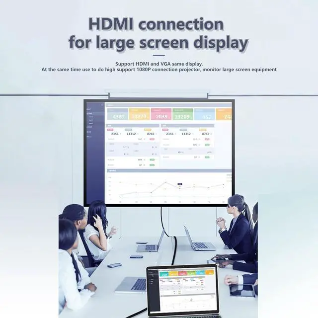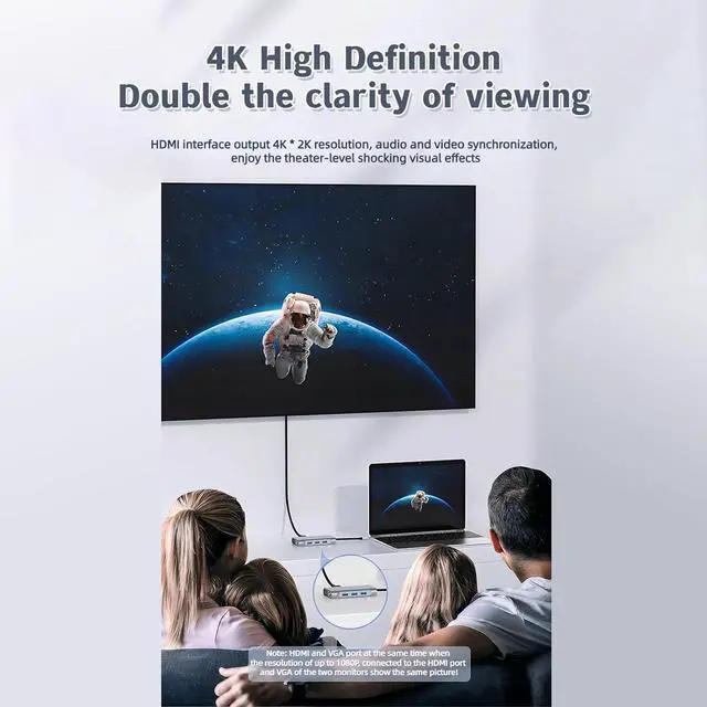 HD CastingThe hub's HDMI interface supports 4K 30HZ 1080P high-definition audio and video synchronous transmission, enjoy the audio-visual feast. It can be connected to projectors, monitors and other large-screen devices with HDMI interface for quick screen casting, HDMI can be used simultaneously with VGA, displaying the same picture when connected at the same time to meet the needs of office meetings, family viewing, large-screen entertainment and other needs.