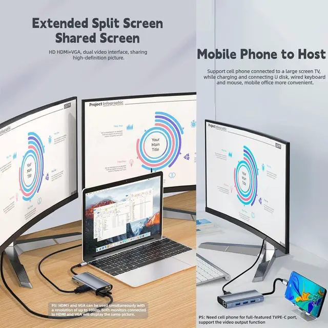Wide Compatibility This USB C adapter has a wide range of compatibility with most models of devices on the market, such as computers, tablets, cell phones, etc. whose interfaces meet the full-featured or USB TYPE-C that supports the video transmission protocol, and HDMI/VGA can be connected to projectors, monitors and other large-screen devices, and USB can be connected to keyboards, mice and other office equipment.