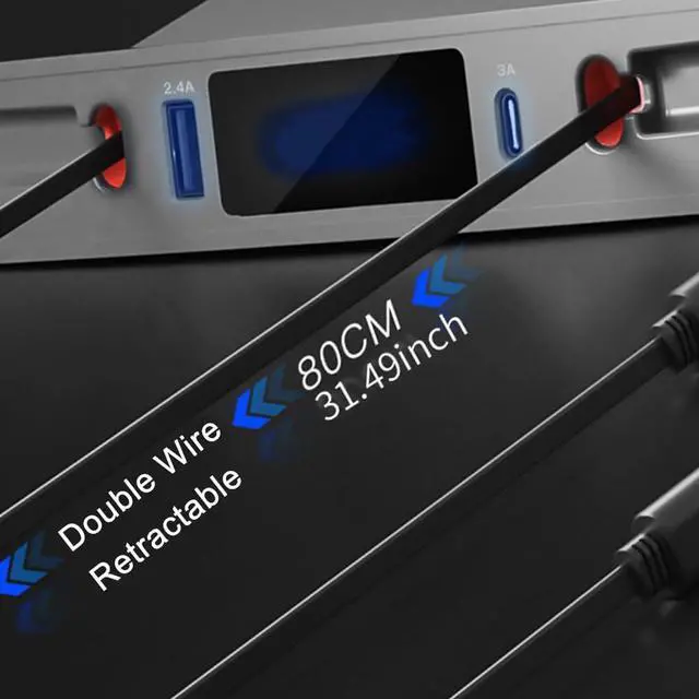 Two Retractable CablesTwo retractable cables are included, the cable length is 80cm/31.49inch, which can be used for both front and rear seats. When you use it, just pull down one end of the interface, you can hear the sound to fix the gear, after fixing it, pull it slightly outward, the cable will be automatically retracted.