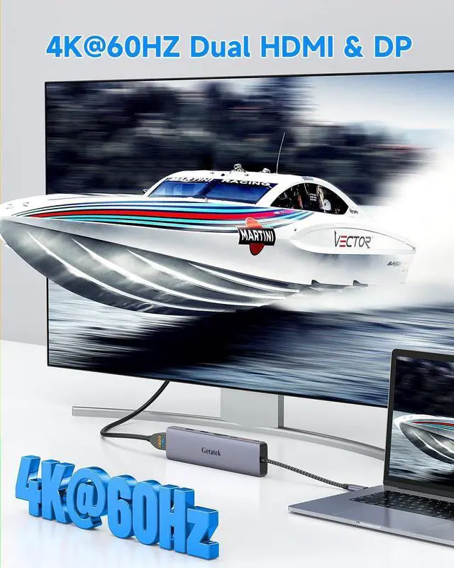 8 in 1 Laptop Docking Station - Plug and play. With this usb c multiple adapter, you will get 3*4K@60HZ Ultra HD HDMI, 100W PD charging port, 1 USB A 3.2(10Gbps), 1*USB A 2.0, SD/TF card reader.