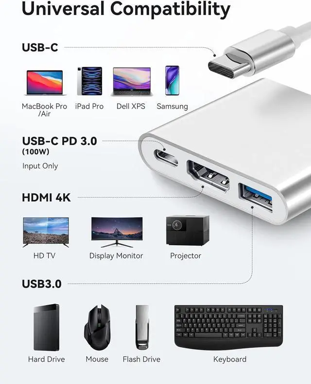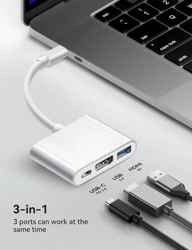 3-in-1 USB C to HDMI Adapter Fubiaofei USBC to HDMI multiport converter can expand your USB Type-C Port(Compatible Thunderbolt 3/4) into a 4k@30Hz HDMI output port, a 5Gbps USB 3.0 port, and a 100W Type-C fast charging port. This 3 in 1 USB3.0 Hub converter can satisfy more of your needs, enjoy charging, data transfer, and ultra audio-visual. All ports can be used simultaneously, no software or drivers required, plug and play.