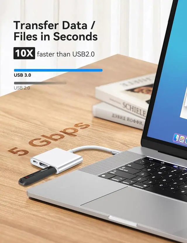 5Gbps High Speed Data Transfer Compared with USB 2.0 (480 Mbps), the USB 3.0 multiport adapter hub is 10 times faster which supports a maximum data transfer speed of 5 Gbps, making you transfer large files and videos in seconds. And the HDMI converter for Macbook air also can easily transfer USB keyboards, mice, hard drives and flash drives. Note: this type-c to HDMI adapter only allow connect 1 HDD/SSD and won't support Apple USB Super Drive.