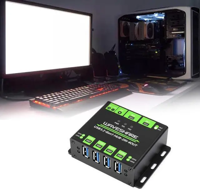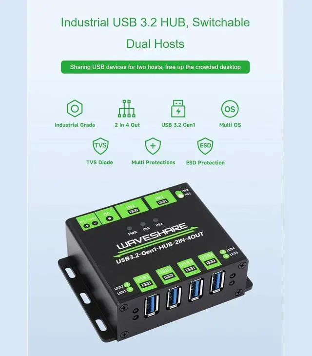 4 extended USB ports, capable of switching between two inputs, providing ESDprotections for each USB port by sharingUSB devices between two hosts, preventing surgedamage and data loss;