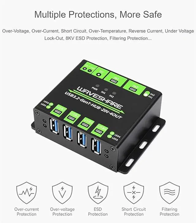 Multiple protections circuits: overvoltage, overcurrent, short circuit, over temperature, reverse current, undervoltage lockout, 8KV ESDprotections, filtering protections, etc.