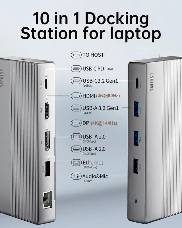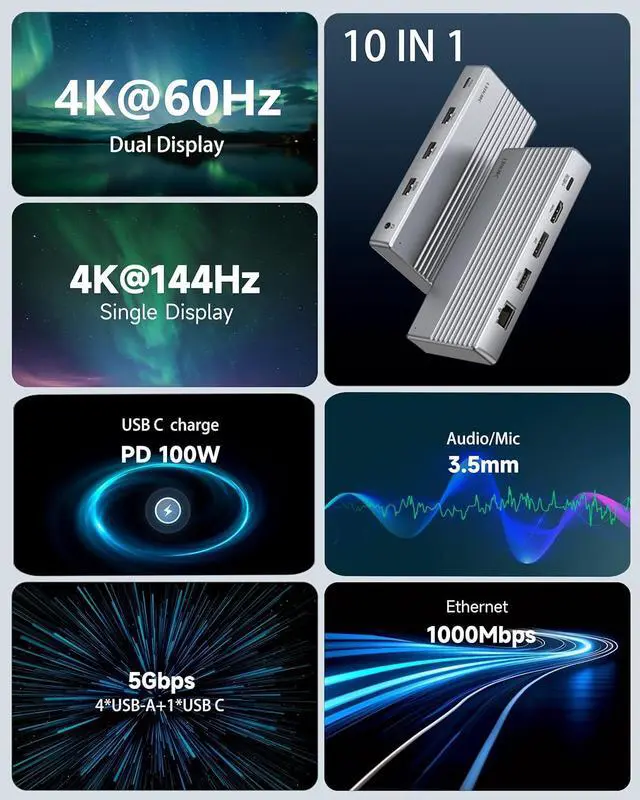 10-in-1 USB-C Computer Docking Station: Expand your laptop's single Type-C/Thunderbolt 3 port to 10 interfacesdual 4K HDMI & DisplayPort outputs, 4 USB-A ports, 1 USB-C data port, 87W Power Delivery, Gigabit Ethernet, and 3.5mm audio. This USB C Docking Station Dual HDMI supports MacBook/Dell/Lenovo laptops for seamless workstation setup.