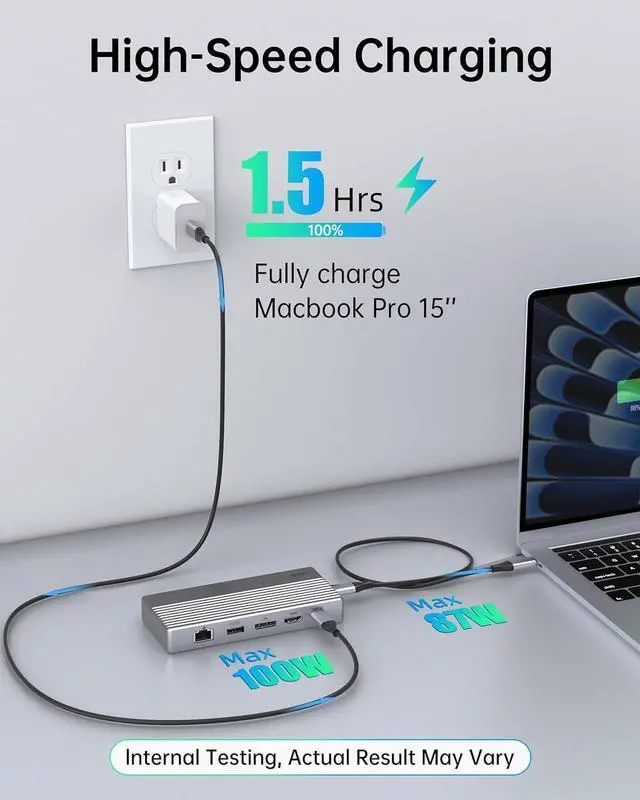 87W Fast Charging & Audio Hub: Deliver up to 87W PD laptop charging and 3.5mm audio/mic port for calls or music. This USBC Docking Station ensures uninterrupted power and clear audio transmission.