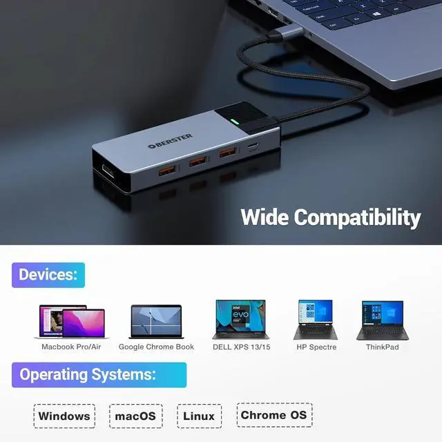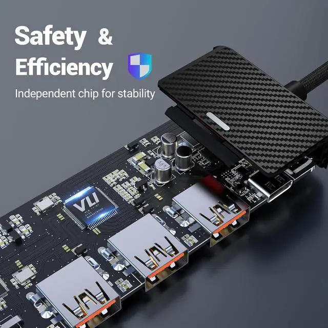 Enhanced Type C Functionality Experience enhanced functionality with the USB C port on this data hub, providing seamless data transfer at speeds up to 10 Gbps and convenient 100W PD charging. Transfer files quickly and efficiently while also enjoying fast charging capabilities for your laptop. The built-in smart chip guarantees the safety and effectiveness of your devices, preventing overload, short circuit, overcharge, and overtemperature.
