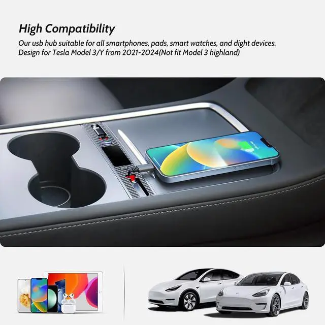Three-color Custom DesignThis Mowlicas USB Hub docking station comes in 3 types of styles to match your center console - Carbon Edition, White and Siliver Gray, giving your Tesla a modern and stylish look