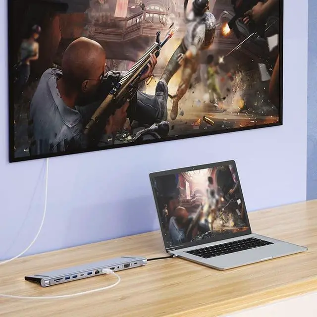 The network card interface can realize network freedom, and can connect 3 display devices at the same time. Support PD fast charging, charging power up to 87W.