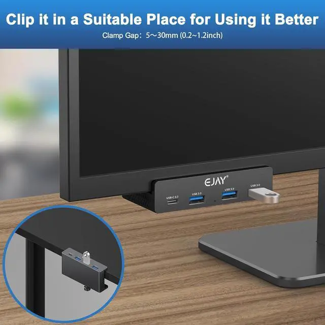 • Innovation Design-No More Sliding: Adajustable Clamp Hub,Replace traditional USB Hub which with the disadvantages of sliding everywhere,hard to plug and unplug and take up space,the new design Hub can fit the thickness from 0.2 to 1.2 inches (5-30mm)extended the USB fuction from host to desk, install the hub where you need at a convenient place,enjoy the stable data transmission more easier and no need to squat down the table to connect every device