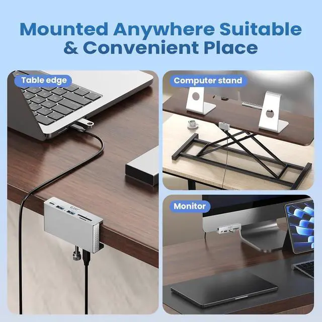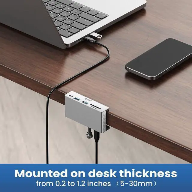 Innovation Design-No More Sliding: Adajustable Clamp Hub,Replace traditional USB Hub which with the disadvantages of sliding everywhere,hard to plug and unplug and take up space,the new design Hub can fit the thickness from 0.2 to 1.2 inches (5-30mm)extended the USB fuction from host to desk, install the hub where you need at a convenient place,enjoy the stable data transmission more easier and no need to squat down the table to connect every device